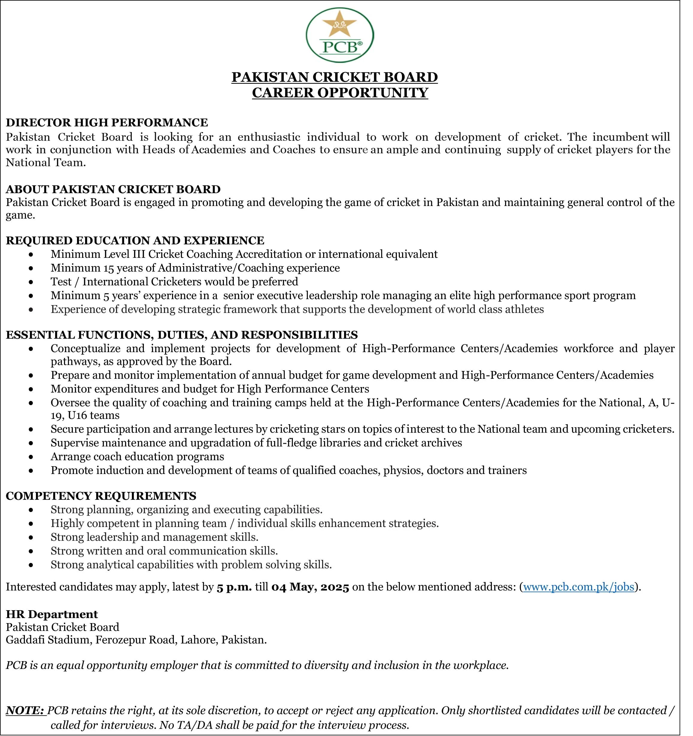 دوسری جانب پی سی بی نے ڈائریکٹر ہائی پرفارمنس کےلیے بھی اشتہار جاری کر دیا۔
