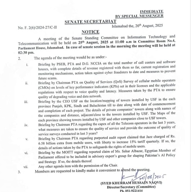 ٹیلی کام کمپنی جاز پر صارفین سے 6 ارب 58 کروڑ روپے اضافی وصولیوں کا الزام، سینیٹ کمیٹی آئی ٹی اینڈ ٹیلی کام نے نوٹس لے لیا،چیئرمین پی ٹی اے سے بریفنگ طلب کرلی گئی ہے۔