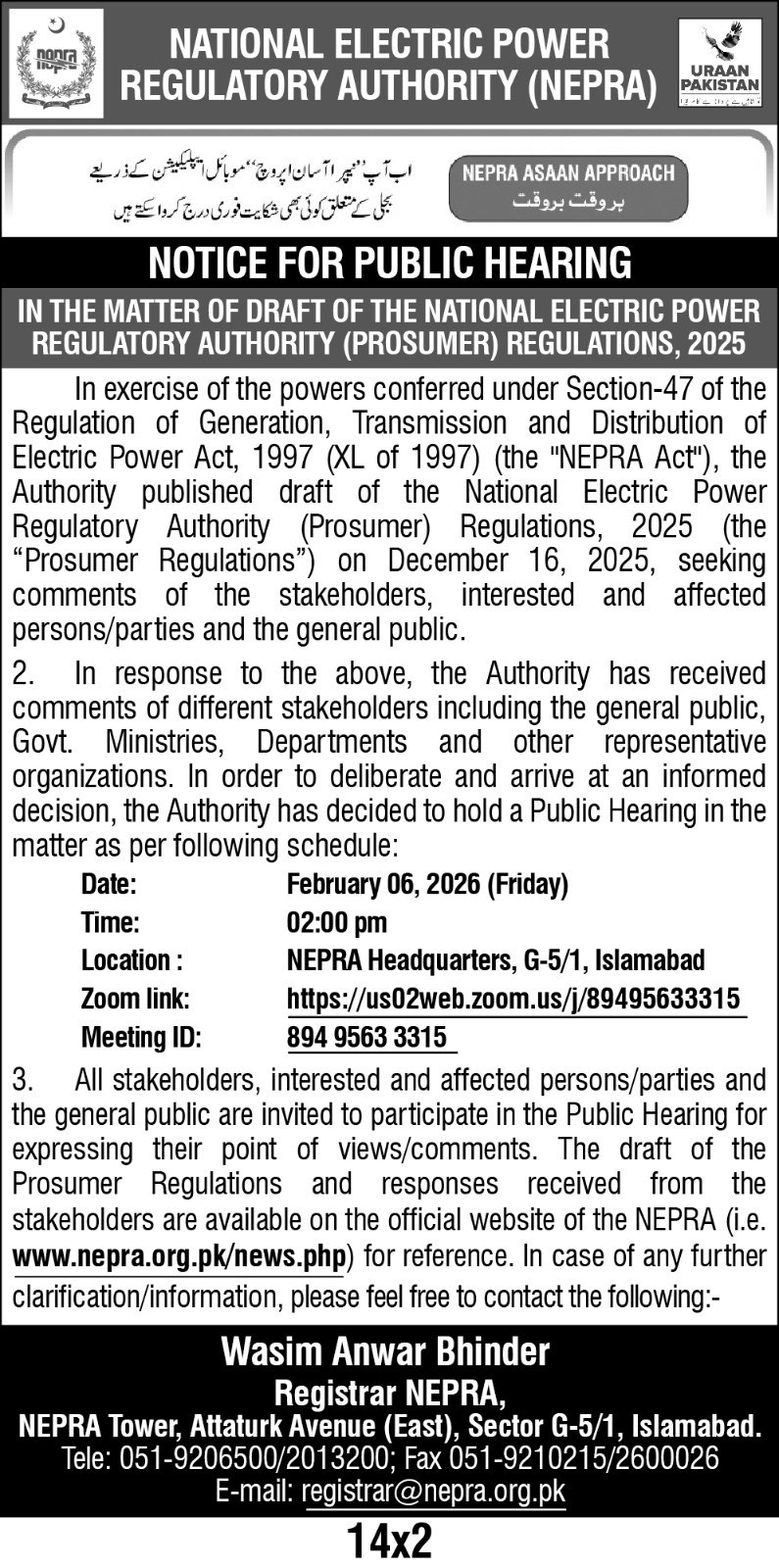نیشنل الیکٹرک پاور ریگولیٹری اتھارٹی (نیپرا) نے شمسی نیٹ میٹرنگ صارفین، یعنی پروزیومرز، کو دیے جانے والے مالی فوائد میں کمی کی تجاویز پر عوامی سماعت طلب کر لی ہے۔ یہ سماعت 6 فروری 2026 کو ہوگی، جس میں شہریوں، سرکاری اداروں، بجلی تقسیم کار کمپنیوں اور دیگر متعلقہ اسٹیک ہولڈرز کو اپنی آرا پیش کرنے کا موقع دیا جائے گا۔
