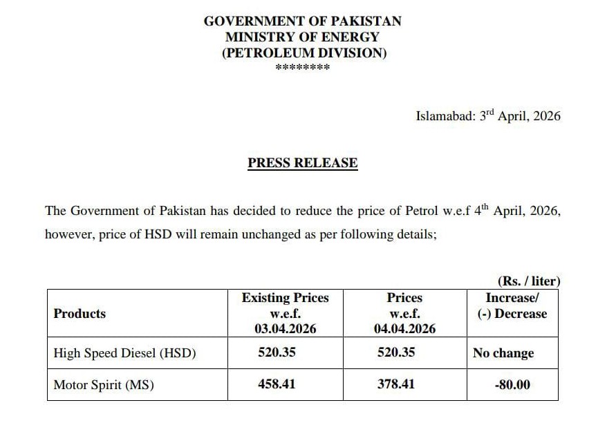 وزیراعظم شہباز شریف نے پیٹرول کی قیمت میں 80 روپے فی لیٹر کمی کر کے نئی قیمت 378 روپے مقرر کر دی، جو ایک ماہ تک برقرار رہے گی